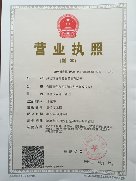 濰坊市百聚源食品有限公司成立于2009年7月份,現(xiàn)位于山東省昌邑市雙臺(tái)工業(yè)園。本公司是一家專業(yè)研究、開發(fā)、生產(chǎn)及銷售調(diào)理食品的企業(yè),主要產(chǎn)品面向全國市場,主要市場有北京、上海、福建、江蘇、廣東、湖北等大型城市的學(xué)校、中級(jí)西式餐廳、大中型商超及行政事業(yè)單位及企業(yè)的配餐供應(yīng)。公司引進(jìn)了國內(nèi)的生產(chǎn)技術(shù)和設(shè)備,年深化加工能力10000噸肉禽產(chǎn)品,將禽肉產(chǎn)品調(diào)理深化加工后,成為可以直接面對(duì)消費(fèi)者的高端產(chǎn)品。產(chǎn)品在國內(nèi)食品行業(yè)內(nèi)具有較高水平。公司于2009年取得全國工業(yè)產(chǎn)品生產(chǎn)許可證,于同年取得清真食品生產(chǎn)經(jīng)營資格。于2011年五月份被昌邑市政府評(píng)為“2010年度食品安全生產(chǎn)先進(jìn)經(jīng)營單位”。2018年被市政府評(píng)為“昌邑市標(biāo)桿企業(yè)”